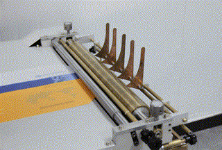 蝴蝶裝對(duì)裱演示 在書殼機(jī)旁配個(gè)簡(jiǎn)易裝置就可以完成A3尺寸精裝書殼的封面上膠、紙張和紙板裱糊等蝴蝶裝對(duì)裱工作。 |