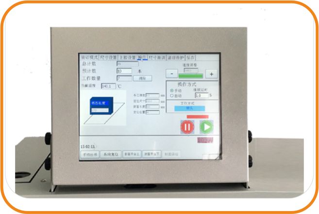 人機(jī)交互界面,中文文字與圖像相結(jié)合顯示10吋觸控主控彩屏,銑背深度、底膠和側(cè)膠量大小、壓痕位置和深度、斷膠位置、方圓脊等均可方便設(shè)定調(diào)整,具備操作記錄、數(shù)據(jù)存儲、工效統(tǒng)計(jì)等功能。